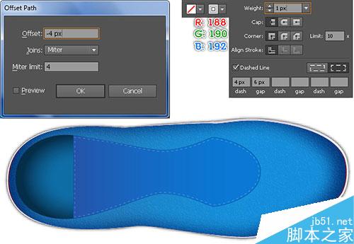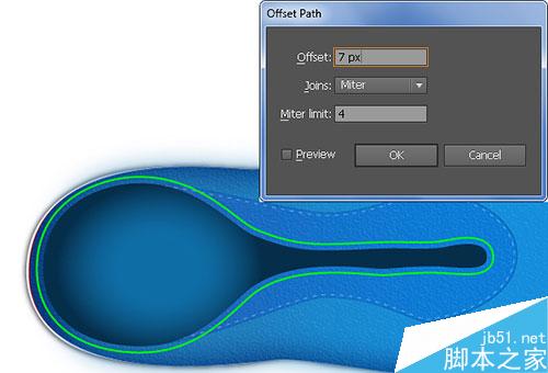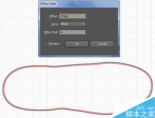 3. 现在你的鞋的轮廓画好了,选择它,菜单-对象-路径-偏移路径,输入:-5px,确定。