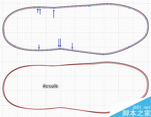 保持对新对象的选择。选择直接选择工具(A),选择蓝色箭头所指示的定位点,按照这些箭头的方向,移动它们一点。最后大致如下图: