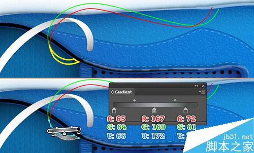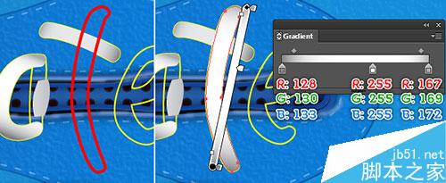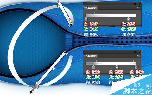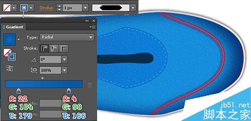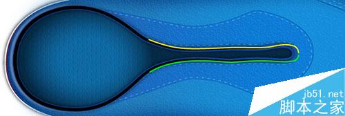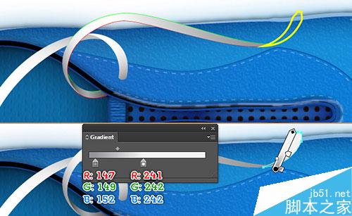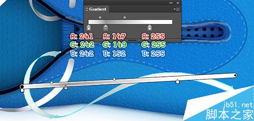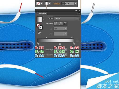 24. 现在,我们制作鞋带 的顶端,用钢笔工具,画出如下图所示的路径。无填充,5px描边(应用如图所示的线性渐变)。