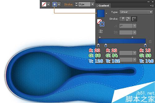 接下来,删除生成的形状填充颜色,并添加一个8px描边(应用线性渐变)。