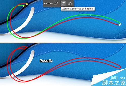 21. 钢笔工具,创建两个弯曲的路径,如下图所示,但你的路径被画好后,选择如图所示的两个锚点(黄色),然后单击从属性栏中的“选择连接终点”按钮。