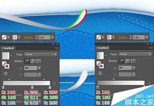 当路径被画好,选择绿色的路径 ,无填充,并添加2px描边(应用如图所示的线性渐变)。