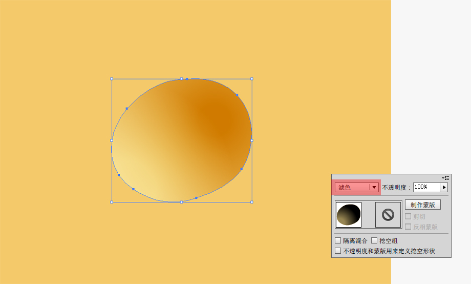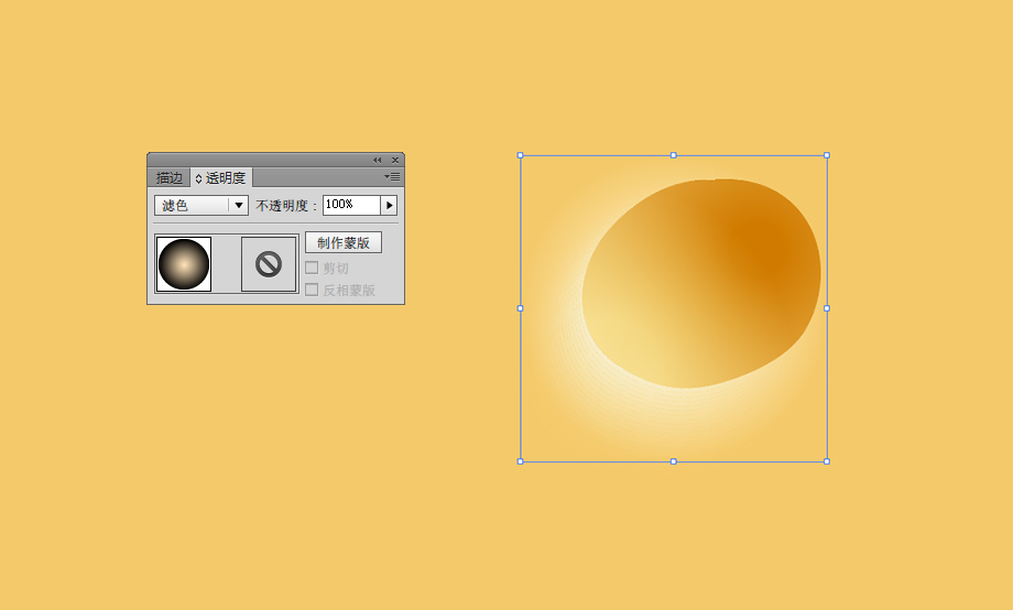 还有一种气孔,边缘比较模糊,好像有点融化的感觉。这类气孔需要我们重新制作。这里,我采用蒙版来制作这种模糊的融化效果。像上一步一样吸取其他气孔的样式后,复制一份粘贴其上。然后选中复制后的对象,打开外观面板,删除最上一层的填充,把下面的黄色渐变填充改为黑白径向填充。