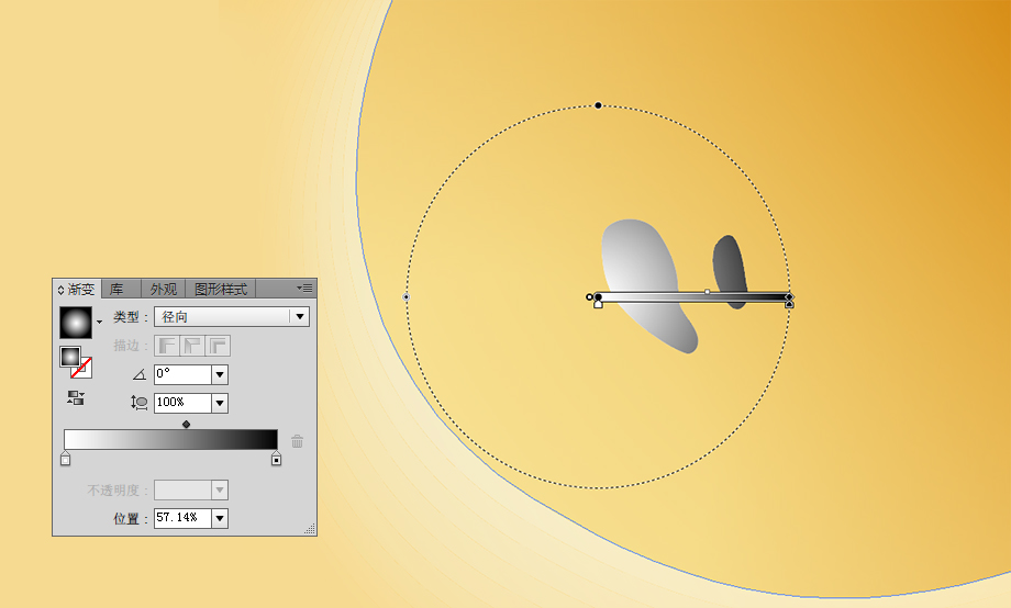 这时还剩下高光反射的部分。先画上两个反射光源的形状。把这两个形状合并为一组。打开这个组的外观面板,对其进行渐变填色。渐变色为黑白的径向渐变。