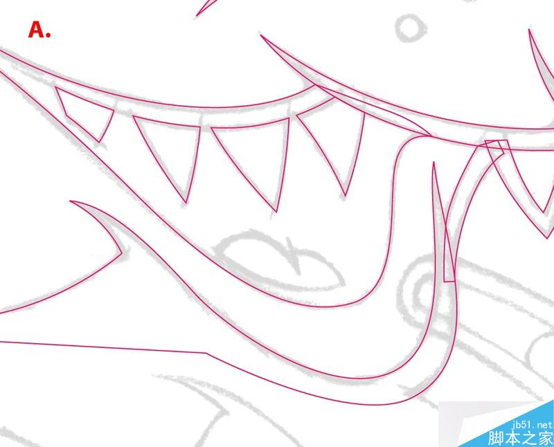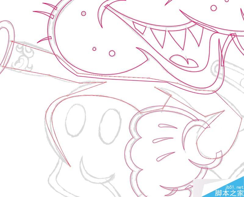 最初的路径绘制,我管他叫"粗模"。上面就是我的粗模完成时的样子。这个的关键是让点在正确的位置,而不要去在意点点之间的路径。(重要!!!)之后再去调整曲线的位置。注意,到现在为止,我只是按照我的初稿去机械的矢量绘制,没有任何猜测的过程,如果一开始你的初稿很稀松,之后的矢量绘制就会让你不知道在哪里放点或者面。所以绘制精确的初稿是个好习惯。(这个用到一个插件,自己调整也可以。)