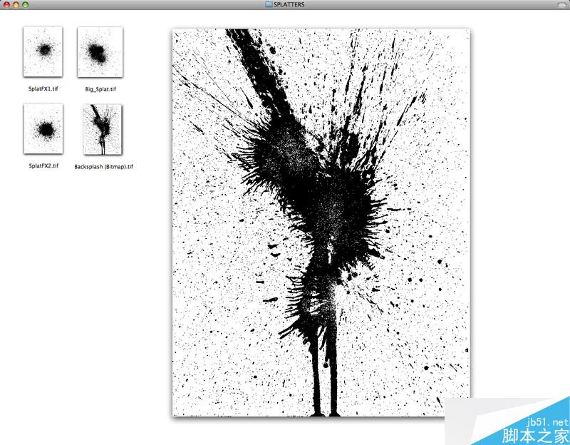 为什么一个娇滴滴的形象要变成拿着把血淋淋的刀?谁知道,可能看起来很cool,适合坏蛋的形象吧。我想玩玩这个家伙,所以我决定给他加点喷溅的纹理。于是我把颜料随意的泼在纸板上,有满意的,扫描下来,变一下颜色,放在我的作品中。为了突出他的形象,我复制了一个外轮廓,然后偏移路径,填充白色。