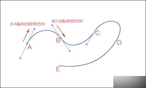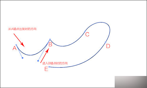 假设我们刚才绘制的5个锚点分别是ABCDE,用"直接选择工具"去单击选中位于AB之间的片断,就会看到刚才我们绘制AB锚点时候定义的方向线