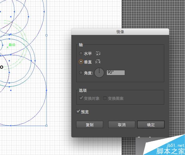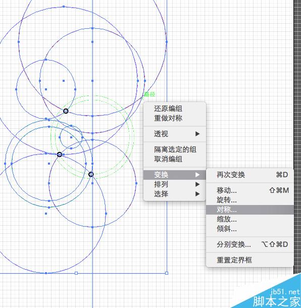 4、现在选择所有圆圈,除了我们创建的第一个.按COMMAND+G编组.鼠标右键,选择变换-对称.选择垂直并点击复制.
