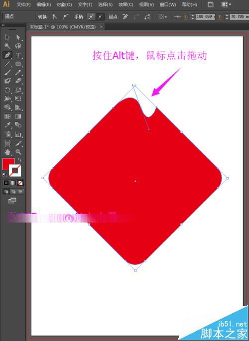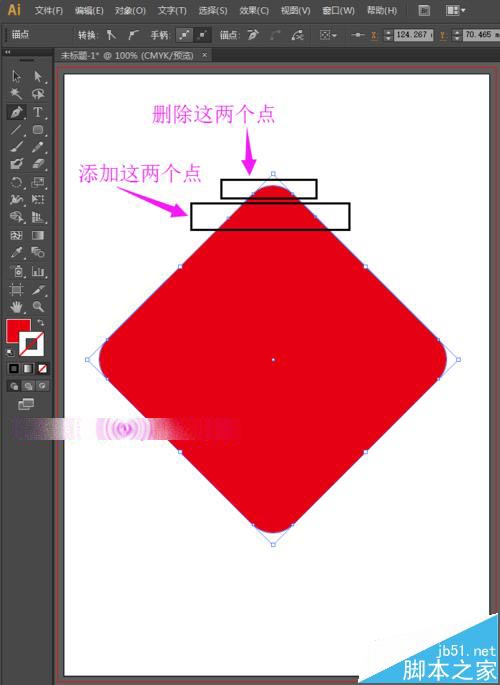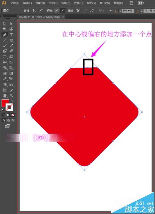 4、选择工具箱中的选择工具,先选中这个圆角矩形;然后选择工具箱中的钢笔工具,在上方的左右各添加一个点,然后删除上面的连个点。如下图所示: