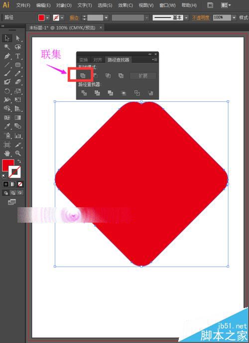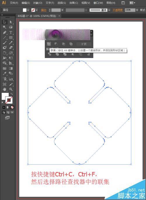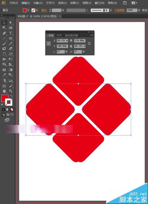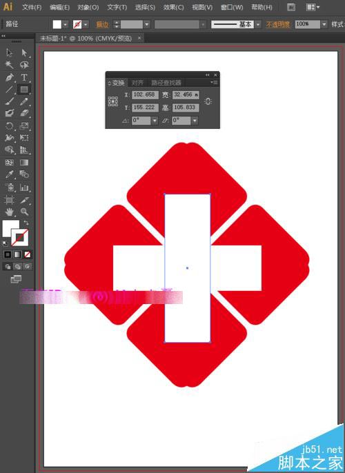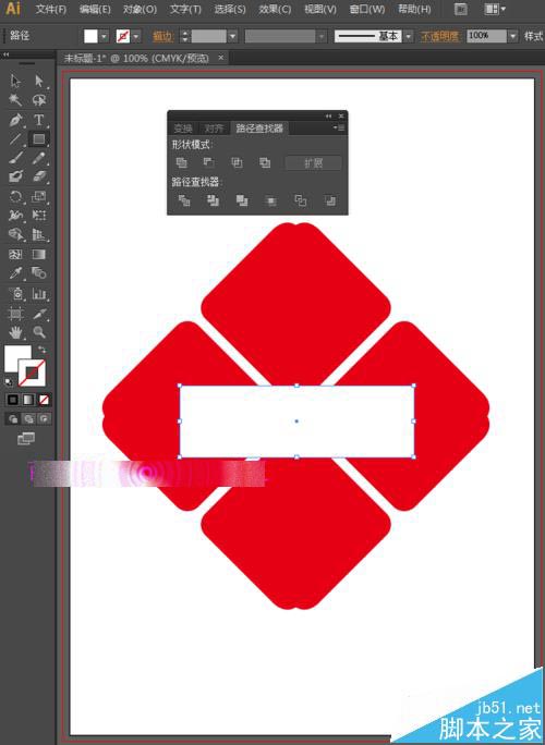 9、为了方便后面的制作,我们可以选择这4个图形,然后点击路径查找器中的联集,将其合并为一个整体。选择工具箱中的矩形工具,将填充设置为白色,描边设置为无,画一个矩形。跟上面相同的方法,我们按快捷键Ctrl+C,Ctrl+V,然后在变换面板中设置旋转角度为90度,按enter键确定。