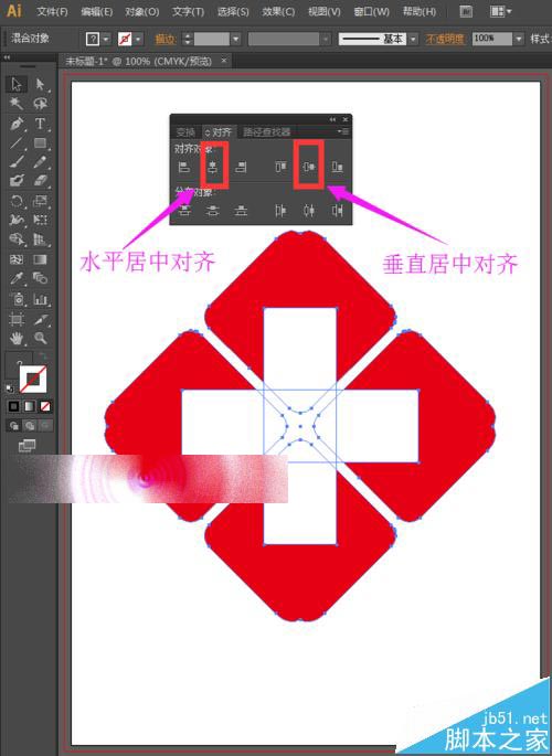 10、选择工具箱中的选择工具,选择这所有的图形,在对齐面板中选择水平居中对齐和垂直居中对齐,如下图所示。