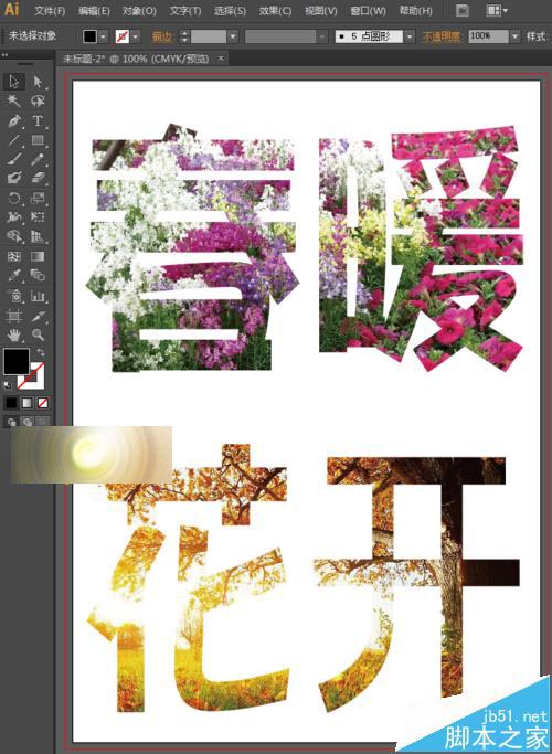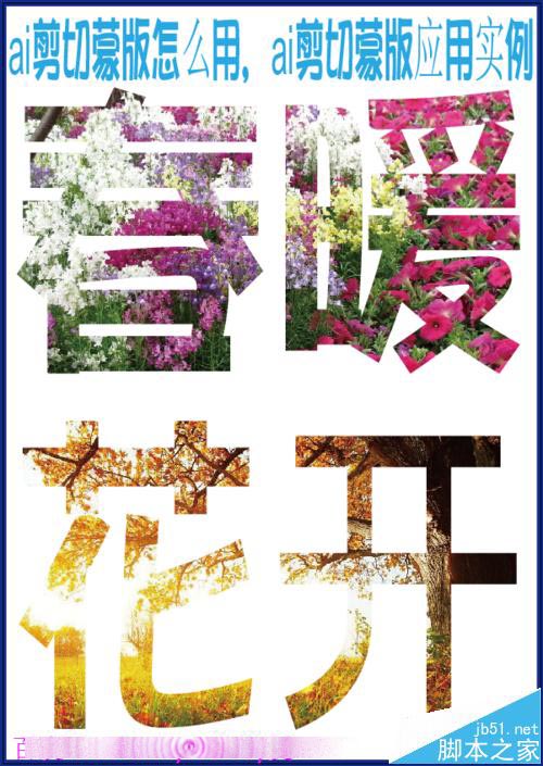 以上就是通过创建剪切蒙版来实现用文字来裁剪花朵图片的一个应用实例。通过上面的实例,我们可以知道:剪切蒙版,是用上面的图形来裁剪下面的图形。