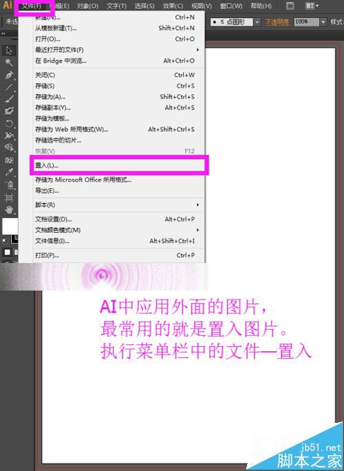 2、现在,我们来置入两张图片。在ai中,如果要应用外面的图片,最常用的方法就是置入我们需要的图片。执行菜单栏中的文件—置入,如下图所示。