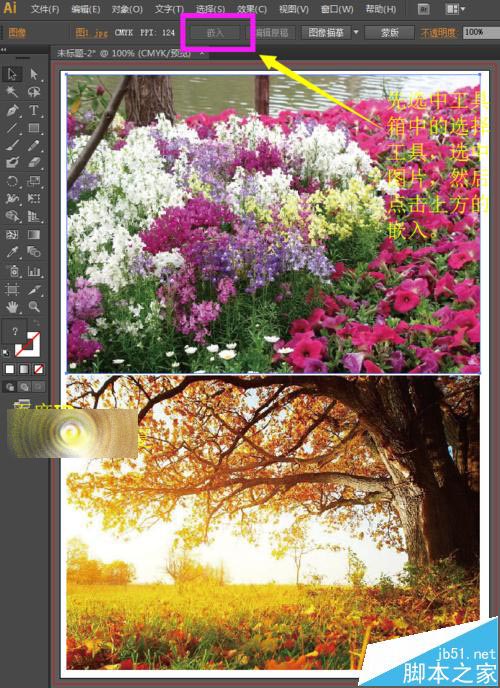 4、置入的图片和外面的图片都是相互链接关联的,也就是如果我们改变了这里的图片,外面的图片也被我们修改了。所以,在这里,我们需要将图片嵌入,使其不关联。选择工具箱中的选择工具,先选中图片,然后点击上方的嵌入;我们分别将两张风景图都嵌入。