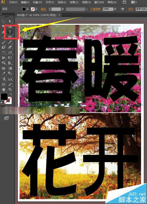 6、文字输入好了后,选择工具箱中的选择工具,选中字体和图片,如下图所示。(注意:一定是选中字和图片。)