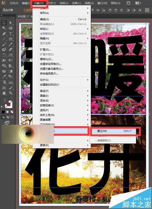 7、将图片和文字都选择好后,执行菜单栏中的对象—剪切蒙版—建立,或者直接按快捷键Ctrl+7,如下图所示。