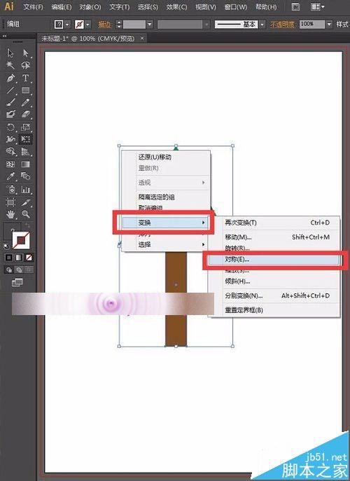 4、我们将鼠标放在图形上,单击鼠标右键,我们可以找到变换,然后在变换的子菜单中找到对称,如下图所示。