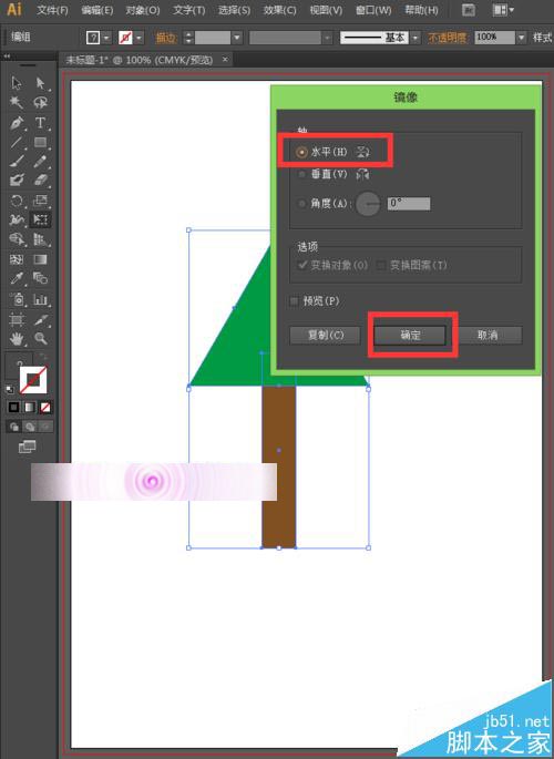 5、点击对称后,我们看到一个镜像的选框,这里有两种类型,一种是水平镜像,一种是垂直镜像,我们根据自己的需要选择径向,然后点击确定。可以勾选预览看下效果图。
