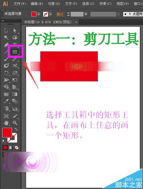 2、选择工具箱中的矩形工具,在画布上任意的画一个矩形。为了方便观看,在这里给矩形填充上红色,如下图所示。