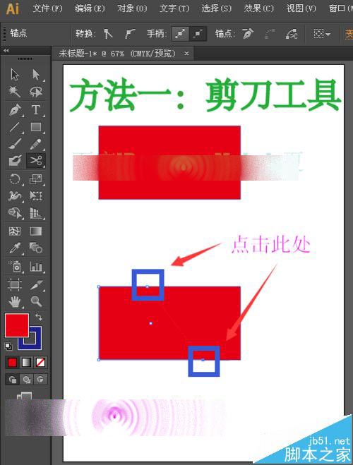 3、为了方便比较,我们选择工具箱中的选择工具选中矩形,然后按住Alt键鼠标点击拖动负责一个相同的矩形。然后选择工具箱中的剪刀工具,在矩形的上面和下面的线段处任意的点击一下。