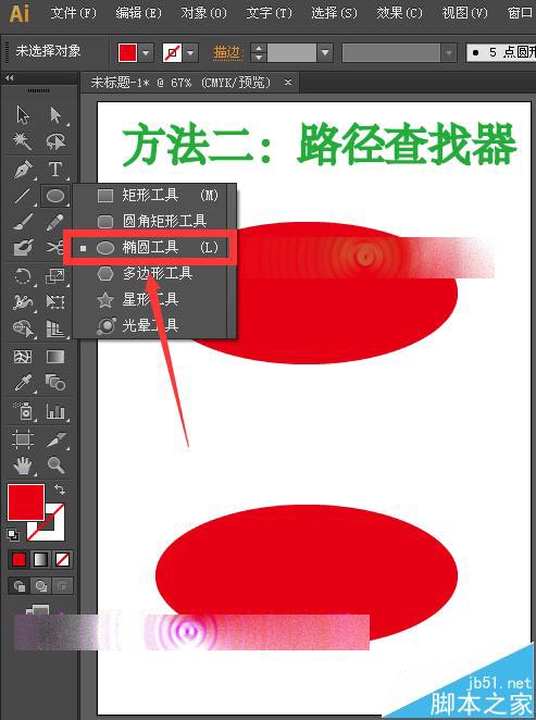 1、选择工具箱中的椭圆工具任意的绘制一个椭圆,为了方便讲解,还是将其复制一个对比,并且给它们都填充红色。