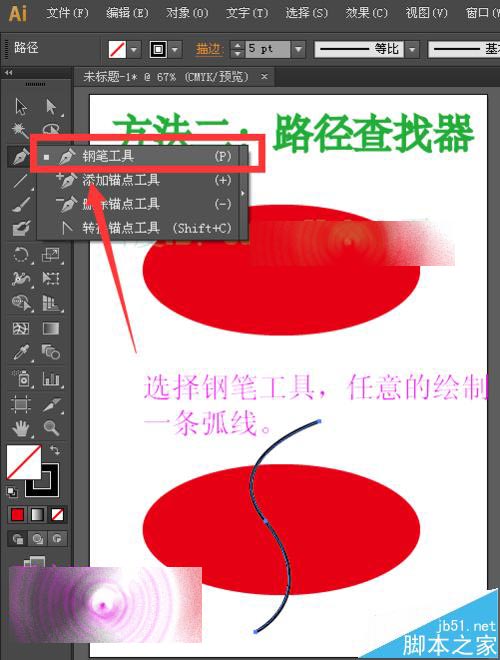 2、选择工具箱中的钢笔工具,任意的绘制一条弧线,这里我们绘制的弧线是之后我们分割的线。