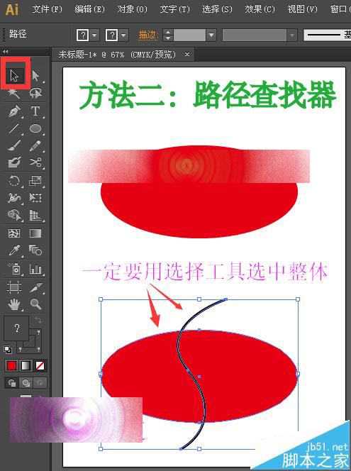 3、选择工具箱中的选择工具,选中整体,也就是选中弧线和椭圆,如下图所示。(注意:一定要用选择工具,选中分割的图形和分割线。)