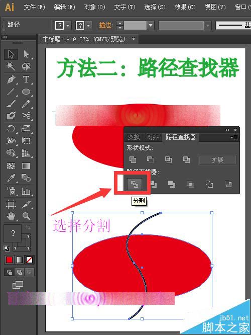 5、在打开的路径查找器面板中,我们选择路径查找器下的第一个按钮“分割”,如下图所示。