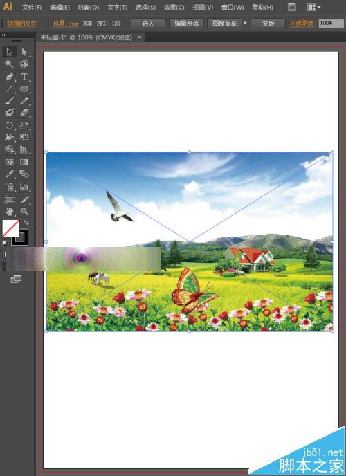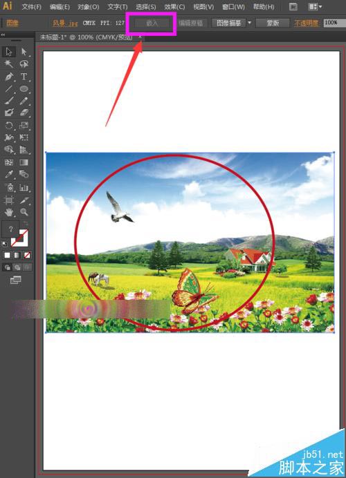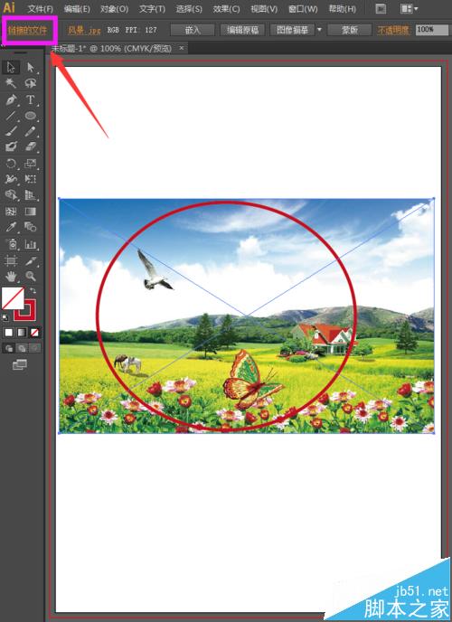 6、出现这种现象的原因是我们的素材图片没有嵌入,如下图所示,我们的图片是链接的图片,没有将其嵌入ai中。