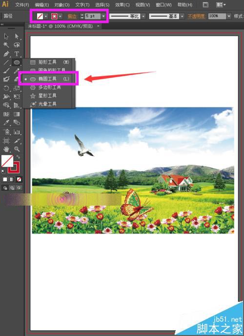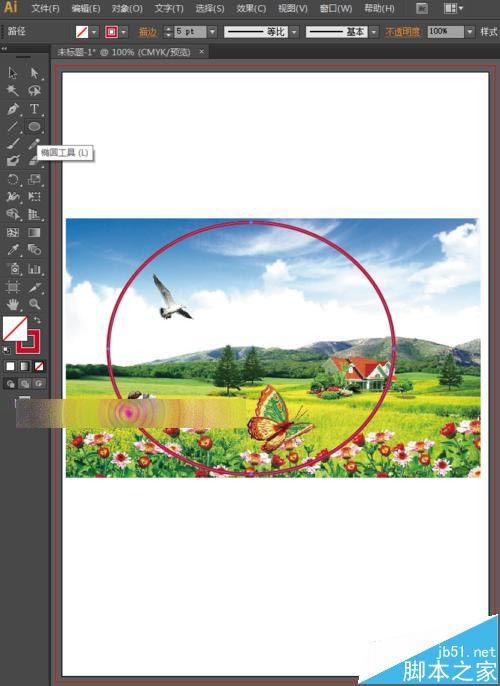 3、选择工具箱中的椭圆工具,我们将填充设置为无色,描边设置为红色,为了方便大家观看,小编将描边设置粗一点,便于大家观察。