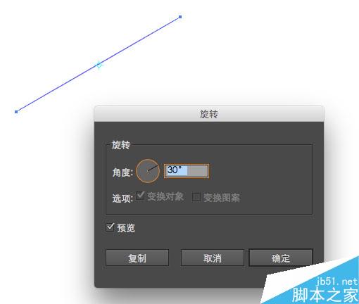 创建2个倾斜的导向,也将有助于我们在进一步的设计.使用直线工具绘制一个水平线段(\).现在去对象>变换>旋转...并在对话框中设置一个30度角.