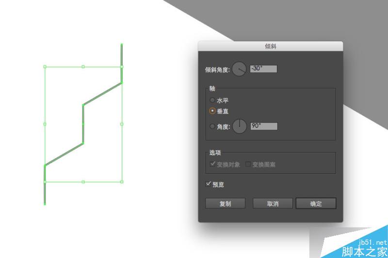 选择所得到的路径,去对象>变换>倾斜…设置30度的角度并在对话框中选择垂直轴.正如你所看到的,台阶的斜率与网格指南的斜率完全对应.