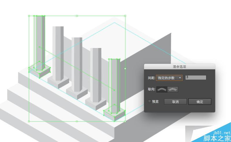 选择这两个栏,然后去到对象>混合>建立.在此之后,到对象>混合>混合选项...并设置步骤所需的数量.