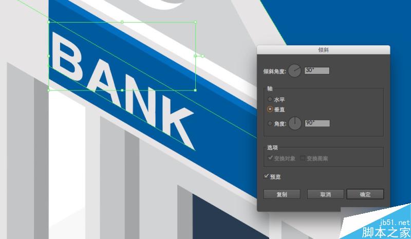 最后,创建一个使用文字工具(T)题词银行,然后去到对象>变换>剪...设定的30度的角度,并选择垂直轴在对话框中.