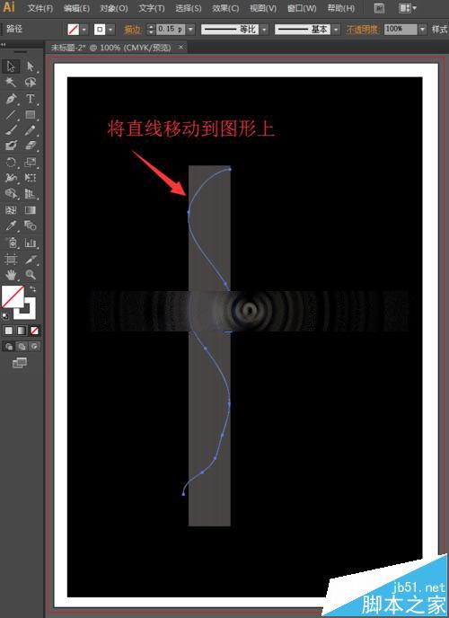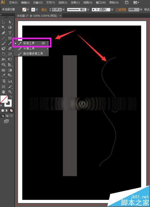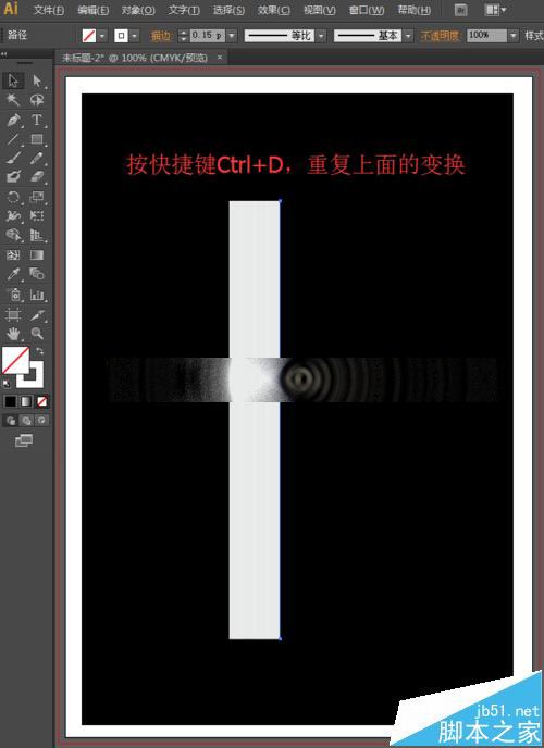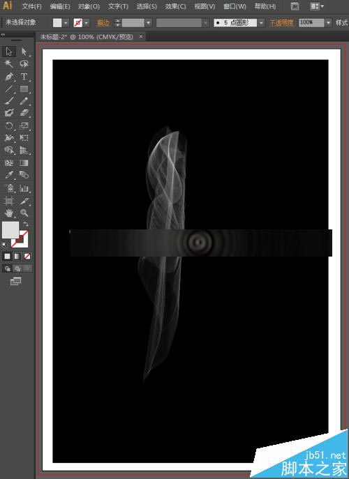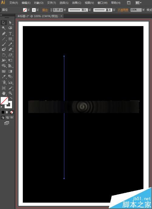 3、黑色的背景已经制作好了,现在,我们来开始绘制烟雾。选择工具箱中的直线段工具,将填充设置为无,描边设置为白色,描边的粗细为0.15pt,然后按住shift键不放,鼠标点击拖动,可以保证画出一条竖直的线。