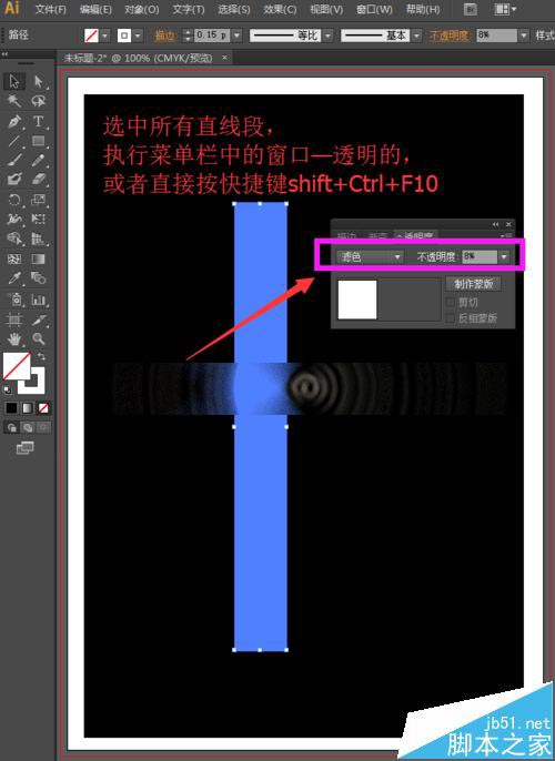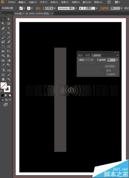 7、锁定黑色的矩形后,我们选择工具箱中的选择工具,选中所有的直线段,执行菜单栏中的窗口—透明度,或者直接按快捷键shift+Ctrl+F10打开透明度面板,我们将混合模式设置为滤色,不透明度为8%。