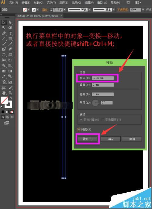 4、选择工具箱中的选择工具,选中这条直线,然后执行菜单栏中的对象—变换—移动,或者直接按快捷键shift+Ctrl+M,打开移动面板,我们设置移动位置水平为0.05mm,其他为0,然后点击下方的复制,如下图所示。