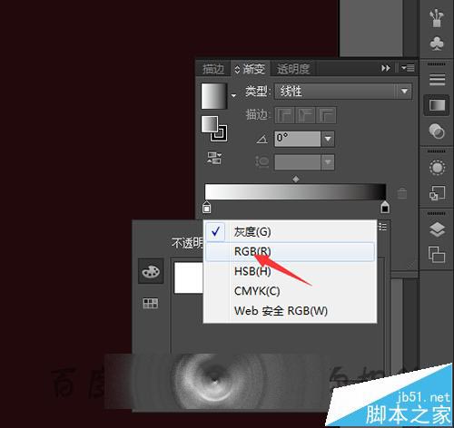 8、点击渐变后,这时在渐变中并没有看到有颜色。这里还需要调出RGB颜色模式。在渐变界面上面双击点击白色的色标。在弹出的界面中,点击右上角的下拉按钮,在出现的列表中把它更改为RGB。然后就会出现颜色的选择。
