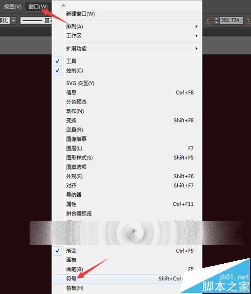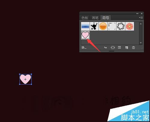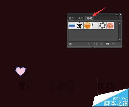 12、在窗口菜单下面选择符号。这里需要先把这个形状定义成符号后,再利用喷枪工具来完成下面的操作。点击符号工具后,在弹出的符号界面中直接用鼠标拉着心形放入到符号的界面中。