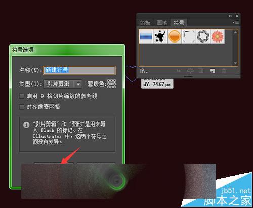 13、接着在弹出的符号选项的界面中,这里的名称,类型及其它的一些选项目可以都不做更改。直接在界面中点击确定。点击之后,就可以在符号的界面中看到刚才制作的心形现在已经添加到了符号的界面中。