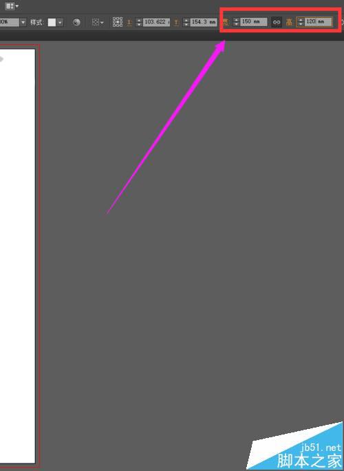 7、选择工具箱中的选择工具,选中矩形,选中矩形后,在上方就会出现我们所选中图形的属性,这时候,我们就可以修改矩形的宽度和高度了。我们在属性栏中将宽度改为150㎜,高度改为120㎜,如下图所示。