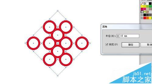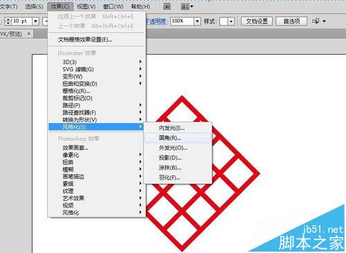4、选择图形后,点开效果-风格化-圆角。勾选预览。发现所有的正方形的角都变成了圆角,但是只需要外面的几个变成圆角。