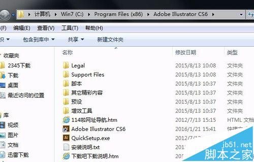 文件夹:大部分在C盘program files (x86)打开,找名称为Adobe Illustrator CS6的文件夹并打开。如有如图所示的文件,那么恭喜你,问题很简单;如果文件夹为空,删除文件夹并清理注册表垃圾后重新下载安装
