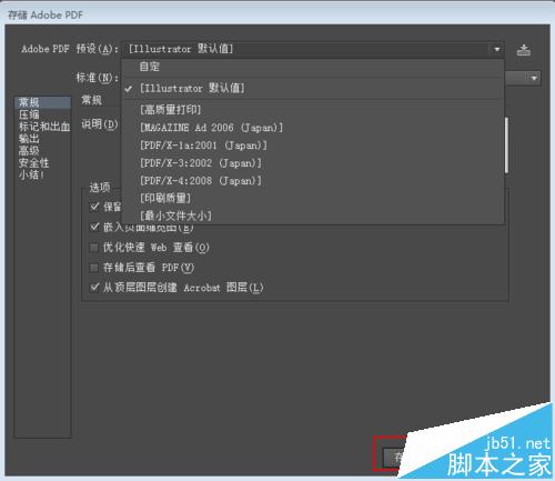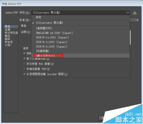 4、存储Adobe pdf,看“Adobe pdf 预设”的下拉框,选择“最小文件大小”,所图所示