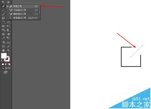 4、接着选择直接选择工具点击正方形的锚点,再按delete删除键,如图所示