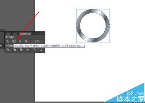 5、在刚才的渐变颜色的图形,画一个正圆,再到路径查找器,选择点击减去顶层,如图所示