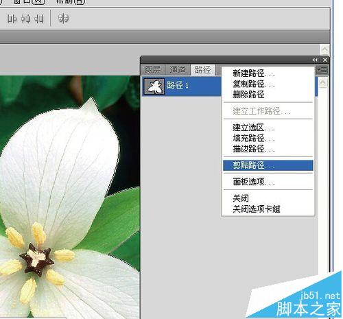 3、选中路径1,在右边的下拉菜单中选择“剪贴路径”,在跳出的剪贴路径对话框中直接按确定就行