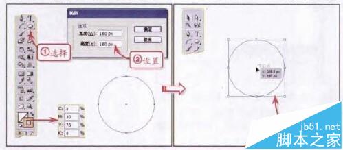 在新建的空白画板中,选择工具箱中的【椭圆工具】,设置【填色】为“无”,【描边】为“橙色”。单击空白画板,并在弹出的【椭圆】对话框中,设置【宽度】和【高度】均为160px,得到无填充正圆。然后使用【选择工具】,将其放置在画板的中心位置。