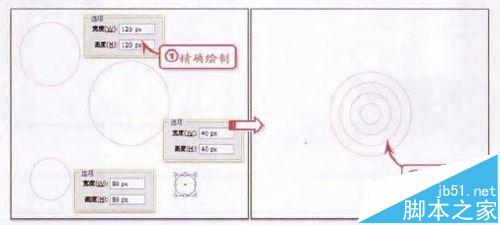 继续使用【椭圆工具】,分别绘制直径为120px、80px和40px的无填充正圆。然后使用【选择工具】,依次将其放置在画板中心位置。