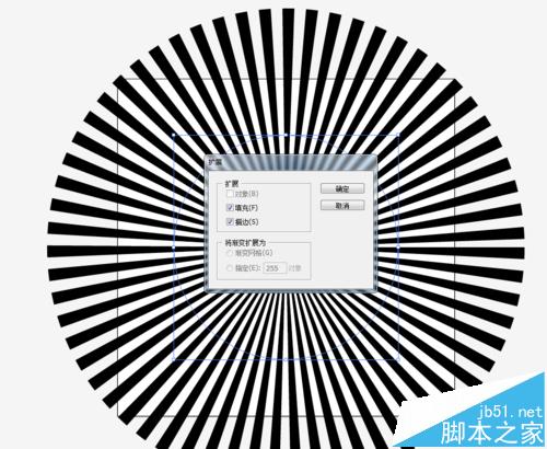 4、如图箭头所示,勾选描边对话框中的虚线,并在前两个数值框中填写数据,敲下回车,就会出现放射效果,改变数值框中的数值,就可以改变放射线的多少。